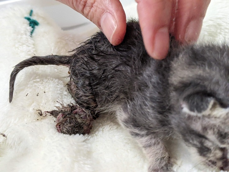 足にへその緒が絡まった子もすぐに外す処置をしていただきましたが、腫れと変形が激しく、足は諦めないといけないかもしれません。そして今日また別の1匹が力尽きて亡くなってしまいました。この子たちは、ただ生まれただけで、どうしてこんなにも苦しい思いをしないといけないのでしょうか。