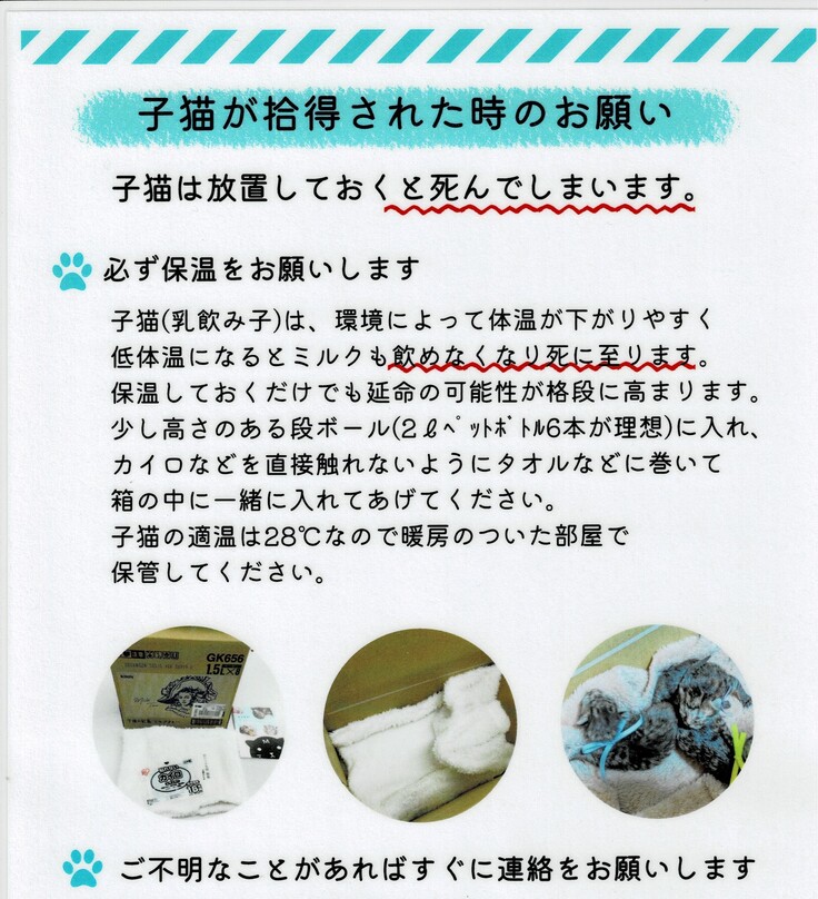たまたま猫や動物が好きな警察官に当たると保温され、時にはミルクまで与えてくださります。その子たちは元気なまま私たちに繋がり、里親へと命のバトンを渡すことができます。しかし、ただ箱に入れ、長時間放置された子たちはまず助かりません。難しい事をして欲しいとは言いません。保温するだけでも救命率が格段にあがることを知って欲しいのです。