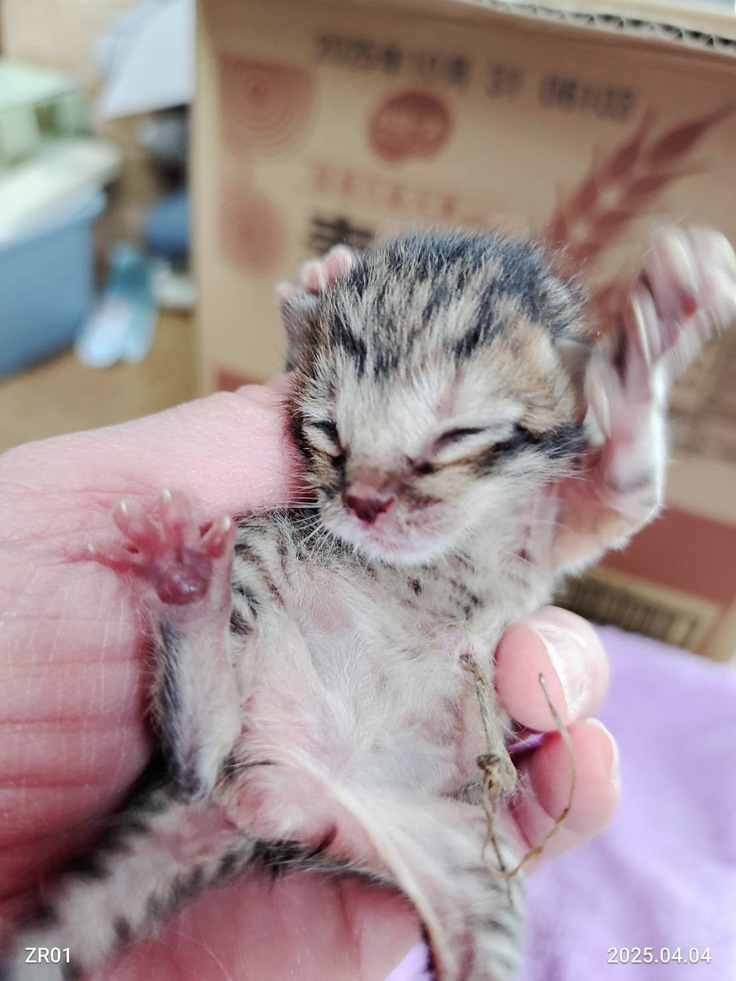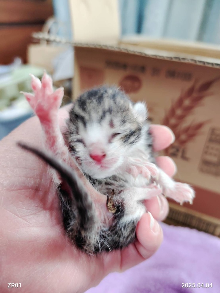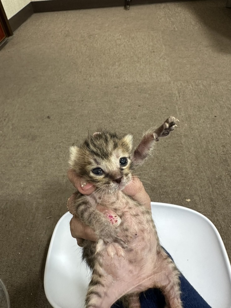 まだ肌寒い春先の4月4日、ある美容院の開店時間の直前、お店の庭に2匹の小さすぎる子猫が鳴いていました。しばらく待っても母猫は来ません。猫が触れずに慌てる美容師さんたち、そこにお客さんである高校生の男の子が来店しました。男の子は無類の動物好きです。保護犬を2頭飼っており、すぐに保護を決めました。親御さんに保護の相談をしましたが、どう見ても自分たちで育てられるサイズではありません。すぐに保健所に連絡をし、保健所から当会へと繋がりました。
