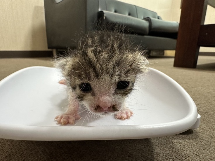 預かって体重を計ってみると72gと70gの未熟児たち。子猫の正期産では100gが普通の体重です。人間の赤ちゃんなら2000g程度しかありません。猫には保育器もNICUもありません。普通なら諦めてしまうような小ささですが、ここで当会のスーパーミルクボランティアの登場です。冷えた体を温め1、2時間おきの授乳、排せつの日々が始まりました。