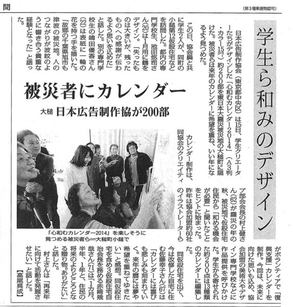 そうだ、温かいイラストでカレンダーをつくり、広告のプロとしてデザインで心の支援をしよう。そう考えた私たちは、会員社に呼びかけて「心和むカレンダー」を競作。約60点から優秀作品を選んで印刷したものを、義援金とともに大槌町の仮設住宅へ届けることにしました。