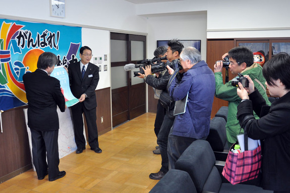 大槌町役場での碇川町長への贈呈式では地元メディアも取材に来てくれました。