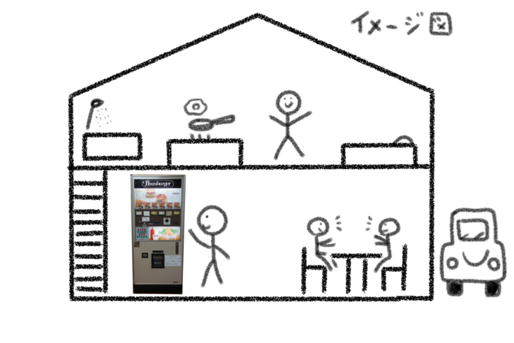 現在、私はアパート暮らしをしています。ここでひとつ一軒家を取得し、その1階を大きなゲストルームまたはフリースペースにして、そこにハンバーガー自販機を設置してはどうだろう? と思ったわけです。
