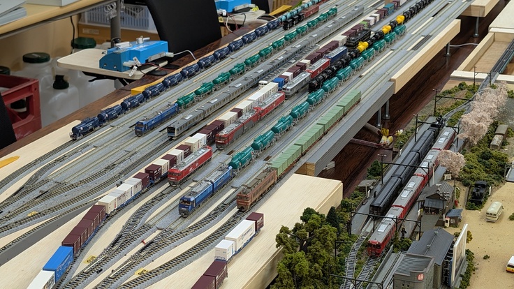 さて、「自由空間かって屋」では、ハンバーガー自販機の販売日と同日にほぼ毎回、鉄道模型の運転会が開かれています。これは、鉄道模型を持っているけれど自宅に走らせる場所が無い方や、自慢の模型車両を見せ合いっこしたいといった様々な方のために、スペースを貸し出しているのです。「レンタルレイアウトさくらい駅」という名称で、富山県内や隣県から参加者が集まり、毎回とても賑わっております。