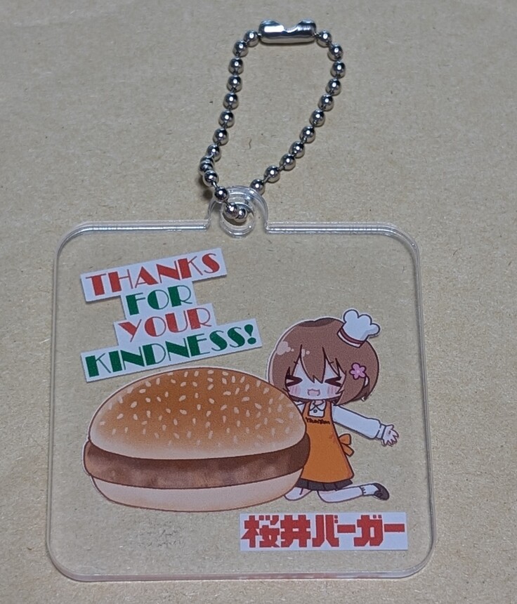 【クラウドファンディング限定・マスコットキャラクター「りっちゃん」アクリルキーホルダー】をご希望の方には、このようなデザインのキーホルダーをお届けいたします。感謝メールの画像にも使用した、ハンバーガー自販機にも使用されている昭和オシャレのフォントがポイントです。
