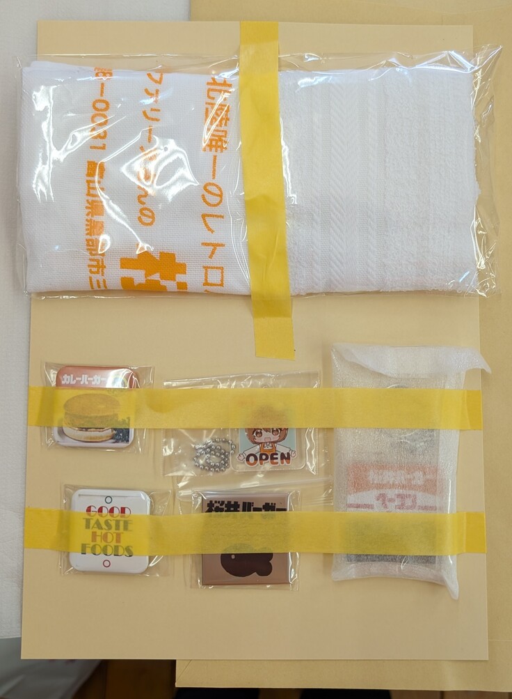 【桜井バーガー関連グッズ・アソートセット】をご希望の方、発送中の荷崩れを防ぐため、厚紙に低粘着テープ(マスキングテープ)で貼り付けてお届けいたします。