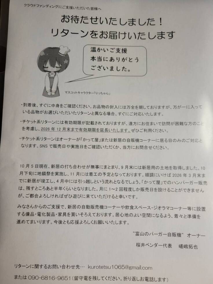 ・希望される方には、自販機スペース内に「クラウドファンディングにご協力くださった方々」としてお名前もしくはハンドルネームを掲示いたします。