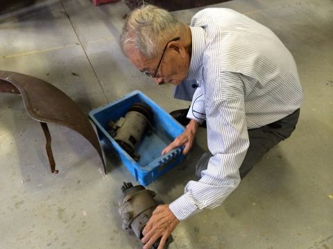 スターターモーターを点検する駒井さん。スターターが逆転防止にギヤーラッチが組み込まれているそうですが、材質が悪かったためによく破損したそうです。この個体は駒井さん自ら点検して、正常であることお墨付きを頂きました!(^^)!