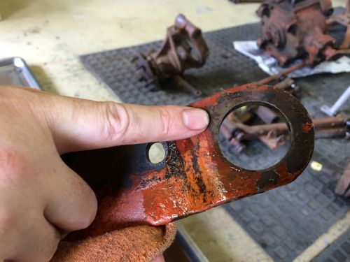 赤い錆止め塗料の下からは、オリジナルと思われるカーキ色がほとんどの部品から出てきます(指差しの場所)。