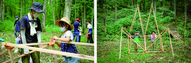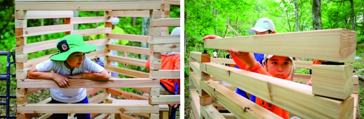 クランピング・パークには、樹木や小川、土といったありのままの自然だけでなく、子どもたちにものづくりのヒントやきっかけ、好奇心を与えてくれる建築物や創作物も順次増やしていく計画です。