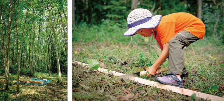 自然物をうまく利用し、工夫しながら自然の中で自由に過ごす。森や川、木や水や土といった自然の恵みを感じ、その中であそびを発見する場所です。