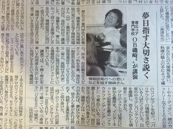 先日ご紹介させていただきました、車いす青年ヒカル君の母校でのプレゼンが、