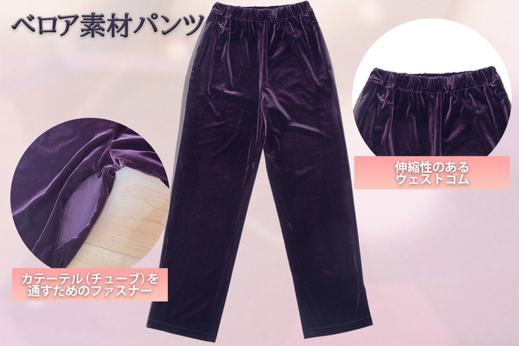 実際に排泄障害がある男女からカテ-テルの交換がスムーズにできる位置にチャックをつけて欲しいという声を聞きました。