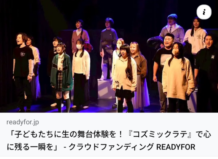 テレビやYouTubeなど画面で見るものとはまた違ったリアルな舞台の空気感や感情が見える舞台をこどもたちにぜひ体験してもらいたいです。