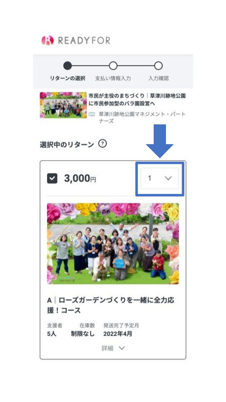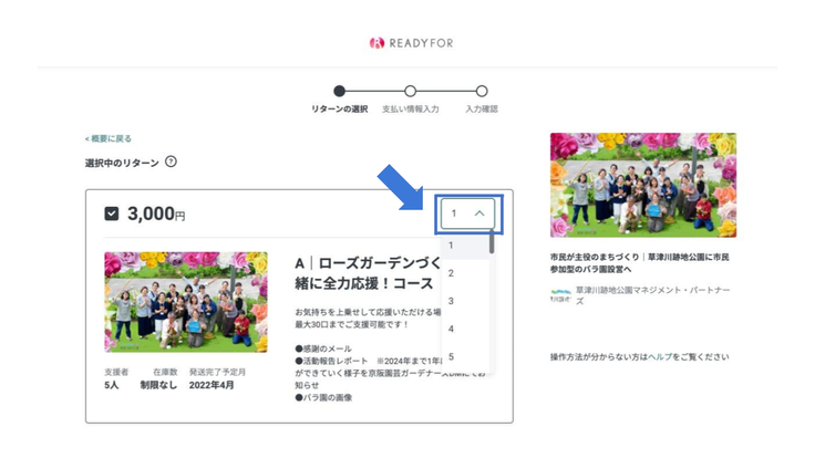 ログイン後、支援内容に間違いがないか確認し、リターン個数を選ぶ