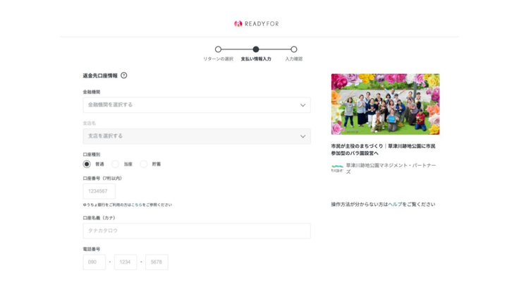 返金先口座情報およびリターンお届け先(住所)を入力