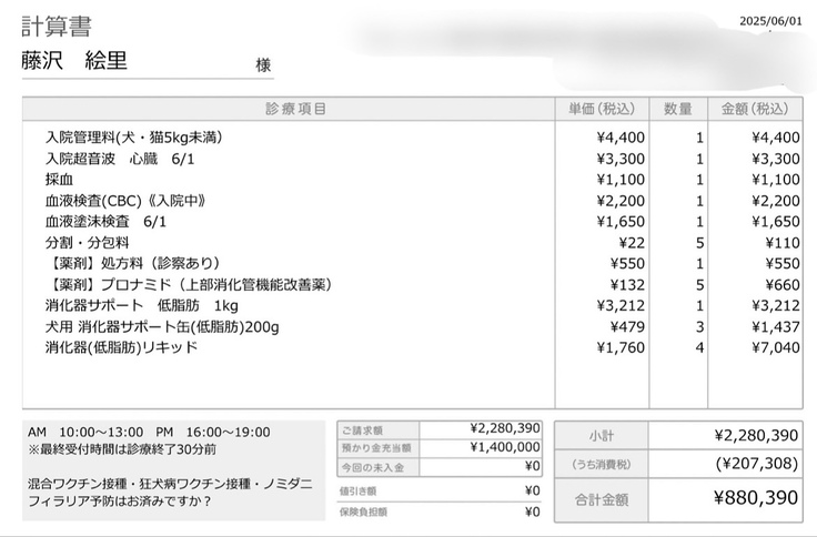 入院前に一部をお預けしており、残りの費用(¥880,390)は次病院行った際にお支払い予定です。