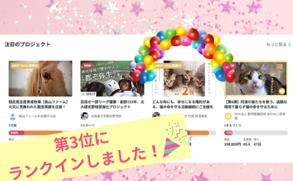 沢山の皆様からのご協力により、先日に続いてクラウドファンディング『注目のプロジェクト』第3位🥉にランクインいたしました!!!
