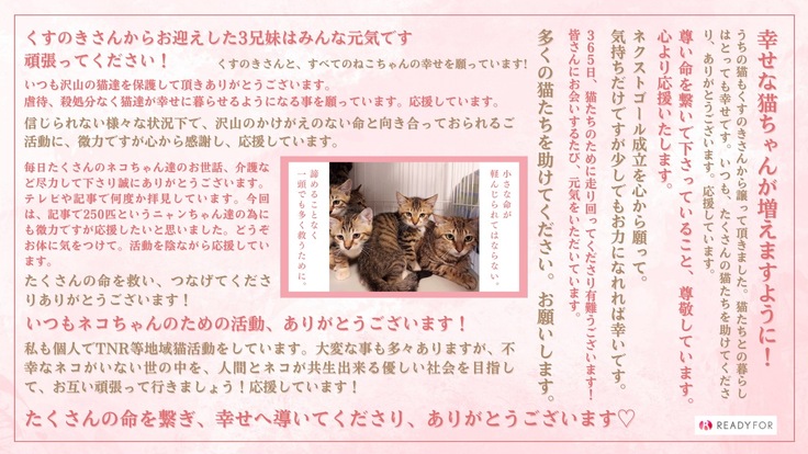 毎日たくさんのネコちゃん達のお世話、介護など尽力して下さり誠にありがとうございます。テレビや記事で何度か拝見しています。今回は、記事で250匹というニャンちゃん達の為にも微力ですが応援したいと思いました。どうぞお体に気をつけて。活動を陰ながら応援しています。