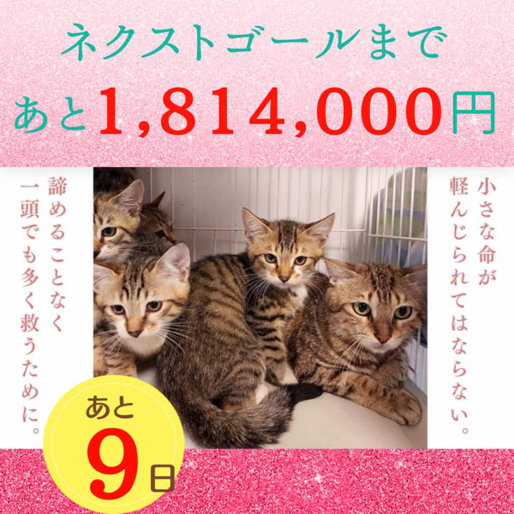 猫たちのため、そしてここまでいただいた応援の声に応えたいという思いで、絶対に!絶対に!達成をしたいと思っており、残り期間も呼びかけや、拡散を行なっております。