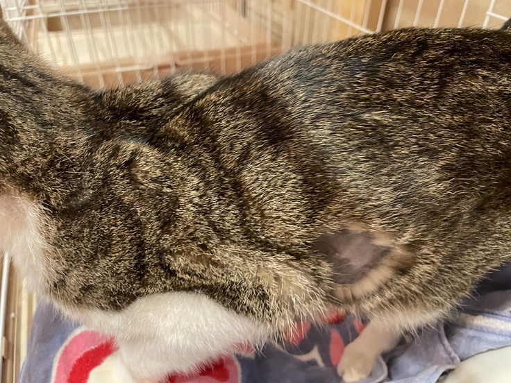 ※保護したところ、耳の下の皮膚が剥けてしまっている痛々しい姿でした。色々調べた所、推定10歳を超える猫ちゃんでなんと歯茎が一部壊死していました…