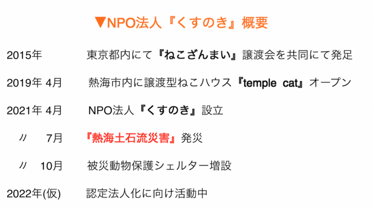 当団体は、2004年に静岡県熱海市にて個人活動を開始して以来、飼主のいない猫達の保護・譲渡活動に取組んでおります。
