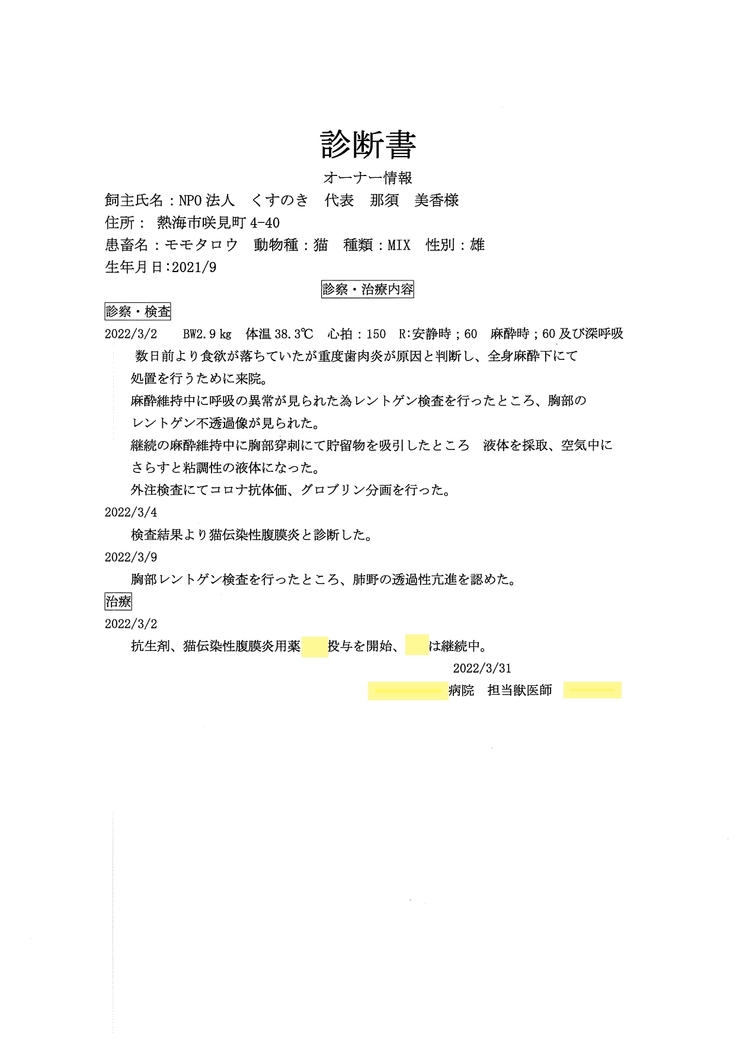 今回皆様からいただいたご支援は、FIPに苦しむモモタロウとナキムシの医療費に充てさせていただきます。