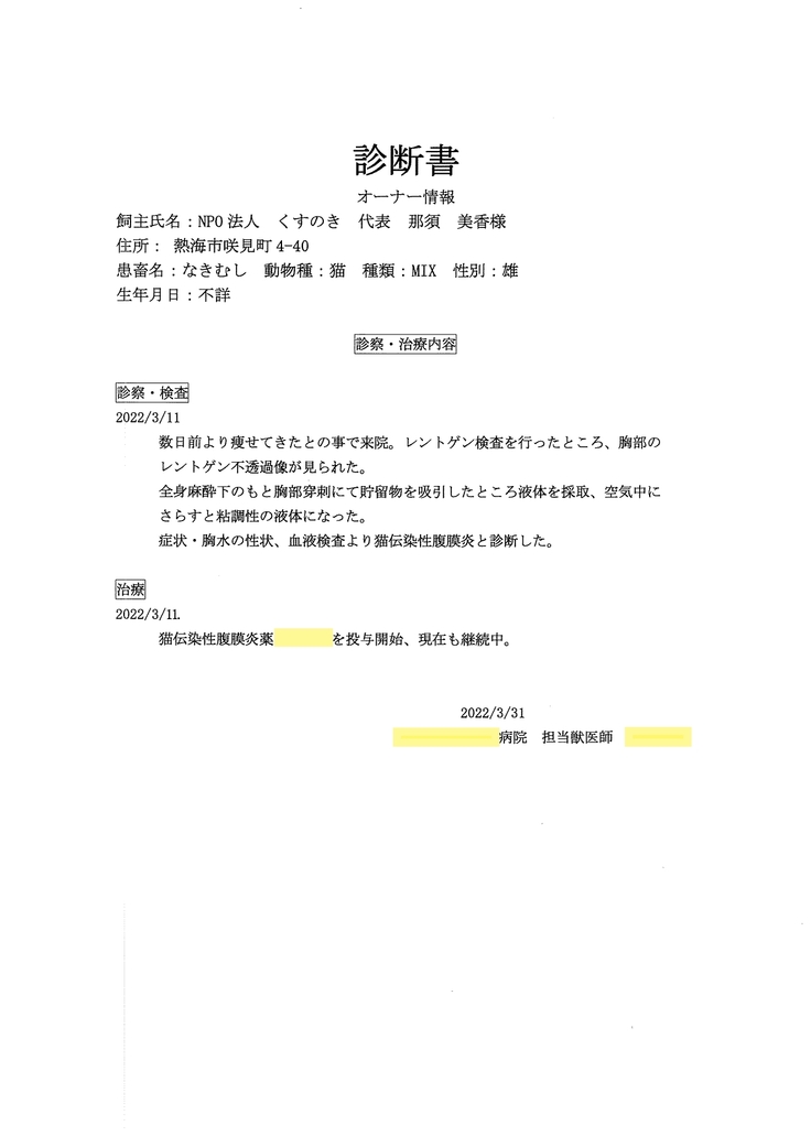 万が一、宝珠やモモタロウまたはナキムシが亡くなってしまった場合、いただいた支援金については、FIP対象個体のこれまでの医療費に充てさせていただきます。