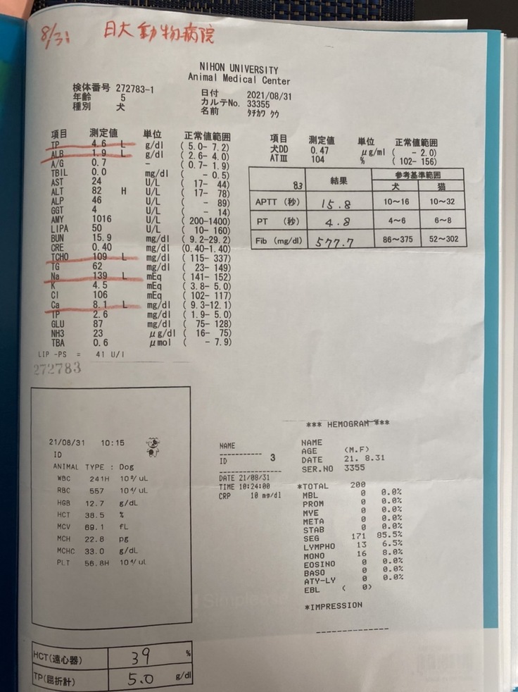明らかに腸が肥大化しており、臓器に癒着を起こしている。腫瘍の可能性が高いとの見解により、回復手術を行い回盲部を一部切除し、病理検査に出さなければ治療方針も立てられないと言われています。