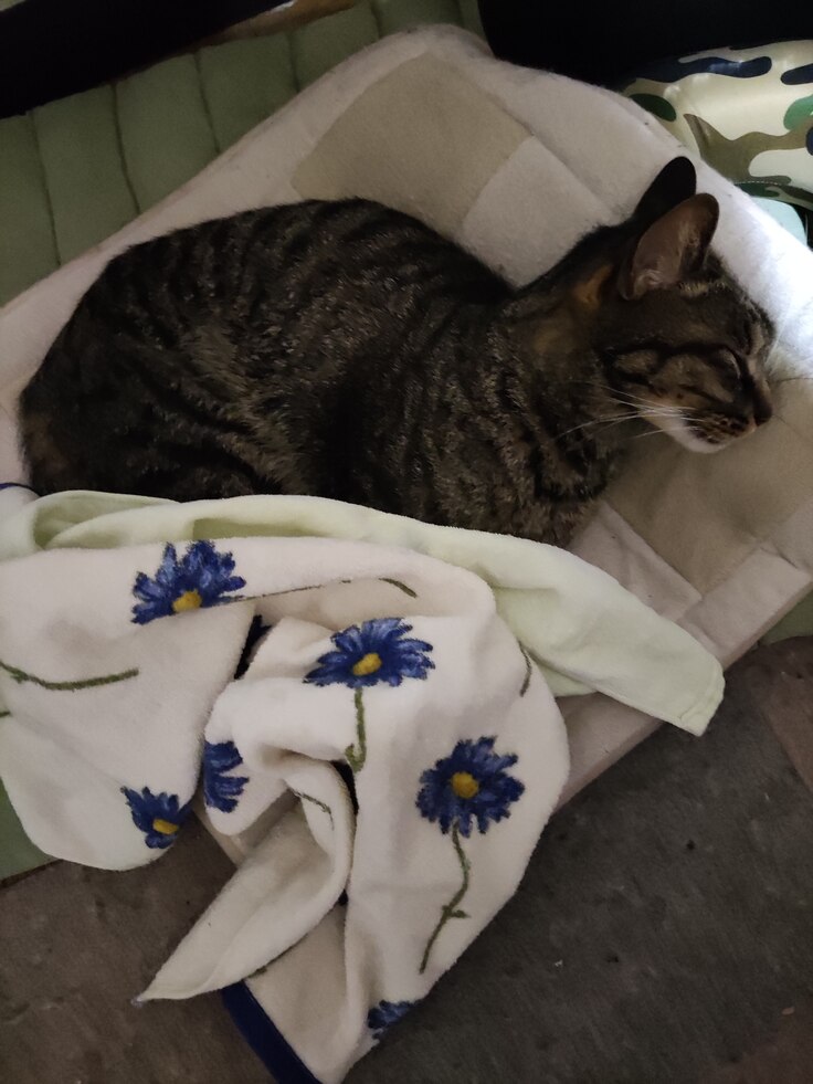 頭を少し高くして脚が冷たいのでホットカーペットをつけタオルをかけています。