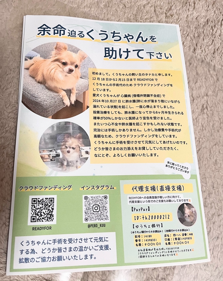 この先のくうちゃんの治療費や兄のペロにも必要になってくるかと思うので、くうちゃんが元気になったら