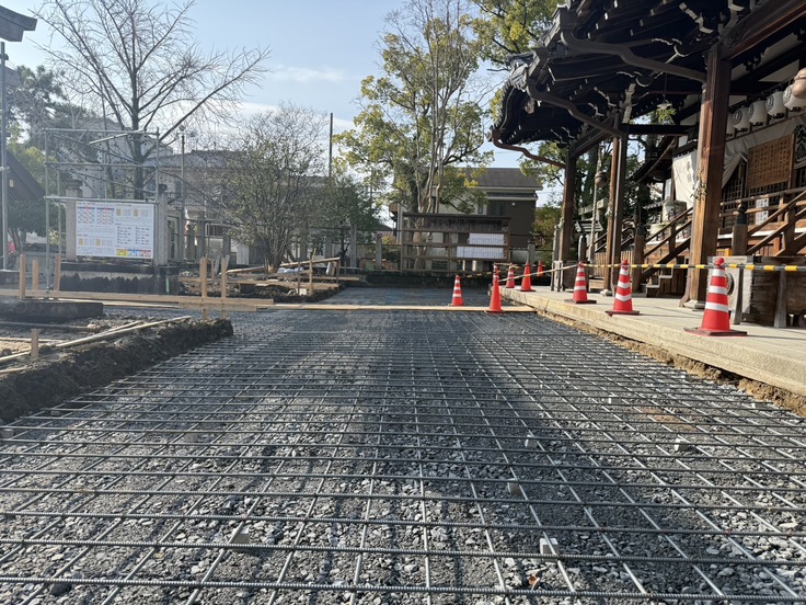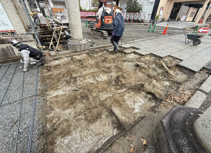 直近では、拝殿前の石畳が捲られ、地盤の工事に着手しております。まさしく皆様にに本クラウドファンディングを通じてご支援を賜りたい箇所の様子となりますので、写真を交えてご紹介いたします。