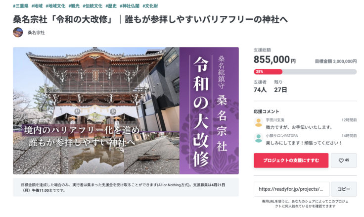 これまでいただいたご支援やお気持ちを、確かに桑名宗社の未来に繋ぐべく、必ずや目標達成をしたいと強く思っておりますが、そのためには3月31日までに50%の達成が必要だと考えております。