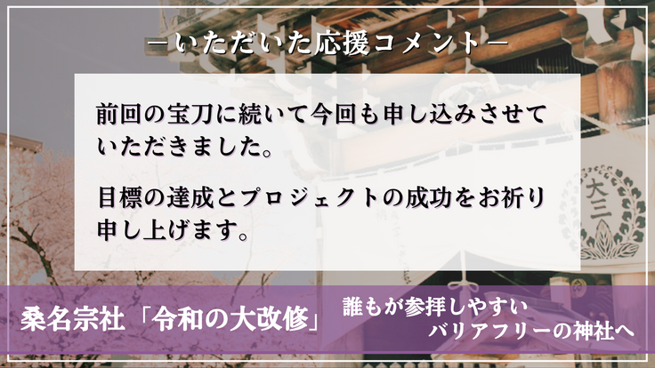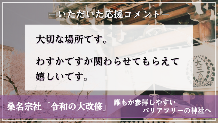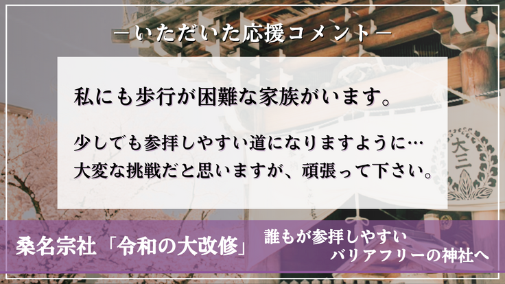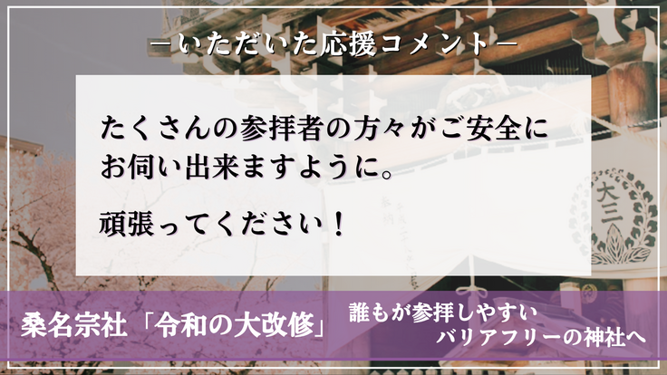 より多くの方が安全かつ快適にご参拝いただける場所となることを願ってくださっている方がいらっしゃることを、改めて実感する応援コメントをたくさん頂戴しています。