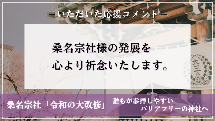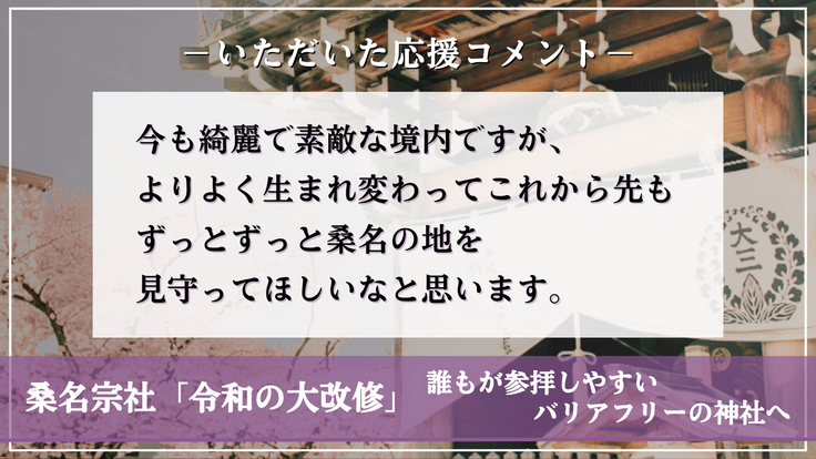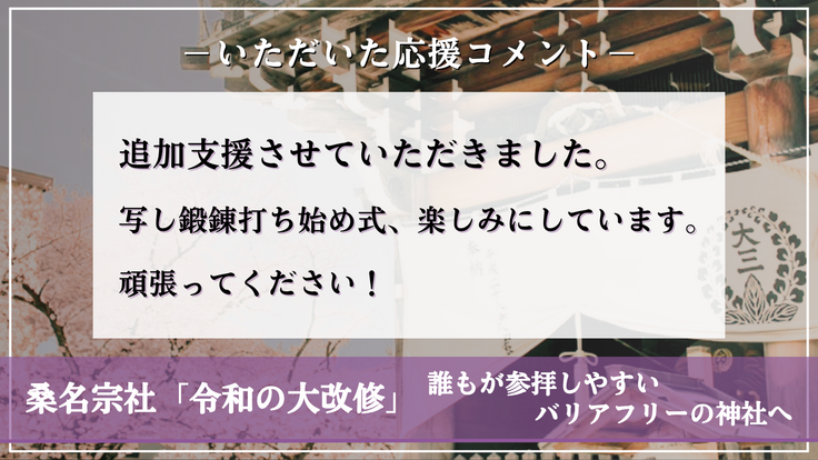 改めてこの場を借りて感謝を申し上げるとともに、皆様からのご支援を桑名宗社の未来に繋げるべく、目標達成に向けて邁進してまいります。