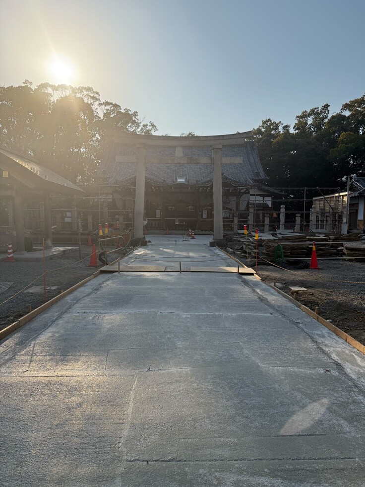 2週間前にご紹介した時には骨組みしかなかった参道に、コンクリートが流し込まれて基礎部分がすっかり完成しました。