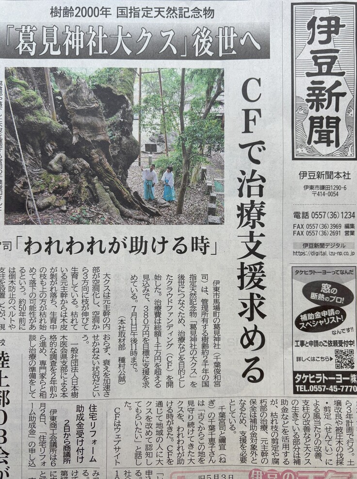 5月28日の伊豆新聞に葛見神社の大樟の樹勢回復事業についての記事が掲載されました。その記事を読んでくださった地元の方々が、大樟を心配して神社に足を運んでくれています。当たり前に存在していると思っていた大樟の現状を知り、ショックを受けている方も多いかもしれません。ですが、改めて大樟の大切さを感じて下さったと思います。今回、私たちがクラウドファンディングに挑戦した理由の一つとして、全国の方に伊東市にある葛見神社の大樟の存在を知ってもらう機会にしたいということもありますが、それと同時に、神社や大樟を後世に残していくための地域のつながりの大切さを再認識してもらいたいという思いがあります。今回のプロジェクトにより、地域の方々に地域で大樟を保全するという意識を持っていただく機会につながっていくと信じております。