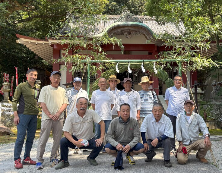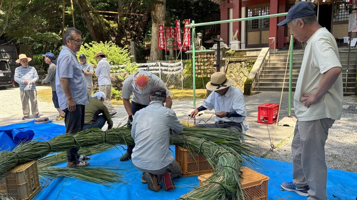 6月22日(日)、梅雨時期の間の晴れた暑い中、葛見神社の元氏子総代の鈴木信一様のご指導の下、氏子総代10名と宮司が毎年恒例となっている茅の輪作りをしました。皆様作業に慣れているので、大変手際良く、今年も立派な茅の輪が完成しました。くぐると元気が湧いてくるような青々しい茅の輪です。6月30日(月)に神事を行う予定です。日頃の罪穢れを払うためだけでなく、大樟に元気になってもらうためにもたくさんの方に茅の輪をくぐって祈念していただければと思います。
