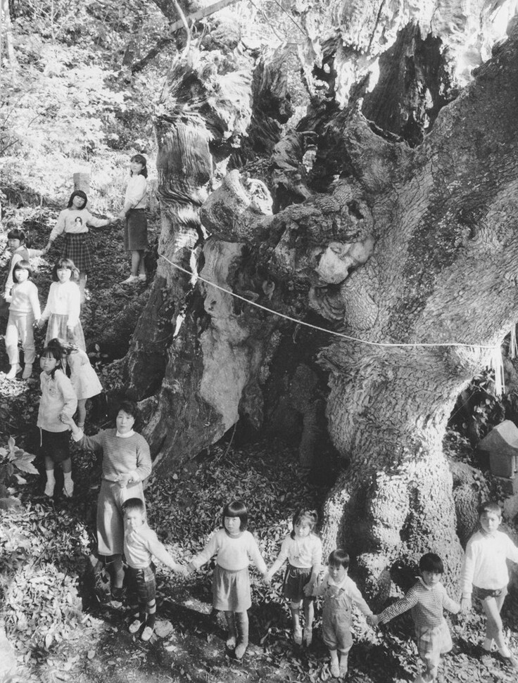 これは、昭和60年(今からちょうど40年前)の5月4日の日本経済新聞に掲載された時の写真です。この写真では皆の顔がわかるように木に背を向けた状態になっていますが、この写真を見て感じることがあります。クラウドファンディングを通して地域だけでなく全国から大樟のためにご支援をいただいている今の現状は、この写真とは反対に大樟の方を向いて、大樟の周りから手をつないだ大勢の人々がうずとなってぐるぐると大きく広がり、全員で大樟を見守っているような印象です。