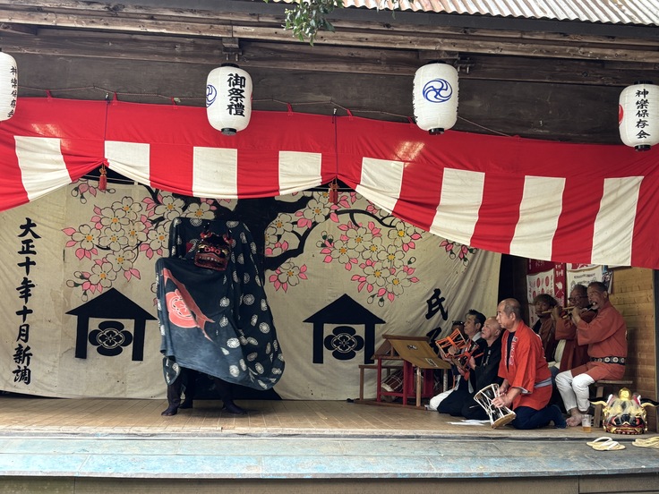 大樟の前では、例大祭の神事に合わせて毎年恒例の神楽保存会(明神會)による獅子舞が奉納されました。今年も邪気を祓うことができました。