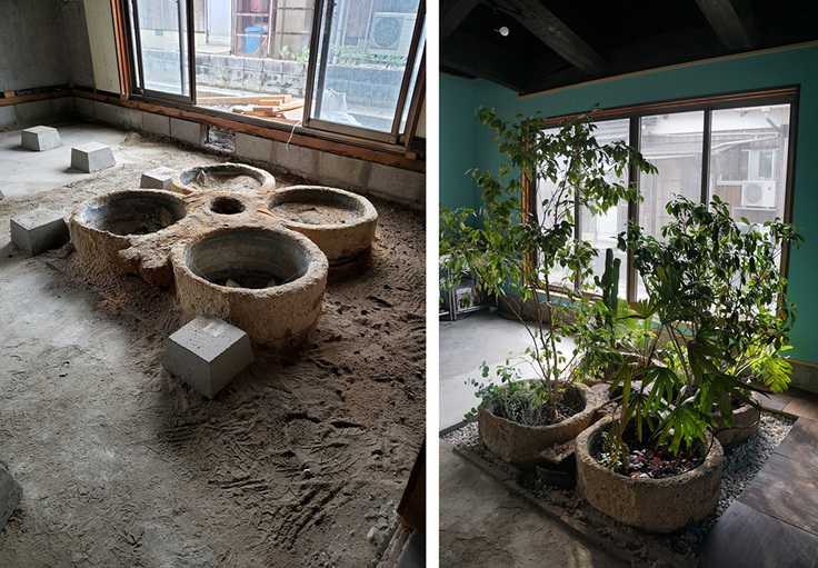 左:床下に残っていた藍甕。 右:藍甕を活かしたプランター