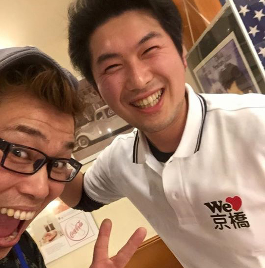 「京橋しゃべり場」代表の鷲見慎一(写真右)です。京橋しゃべり場とは大阪京橋地域の事業主、住民、利用者など京橋好きの若者が集まった団体です。