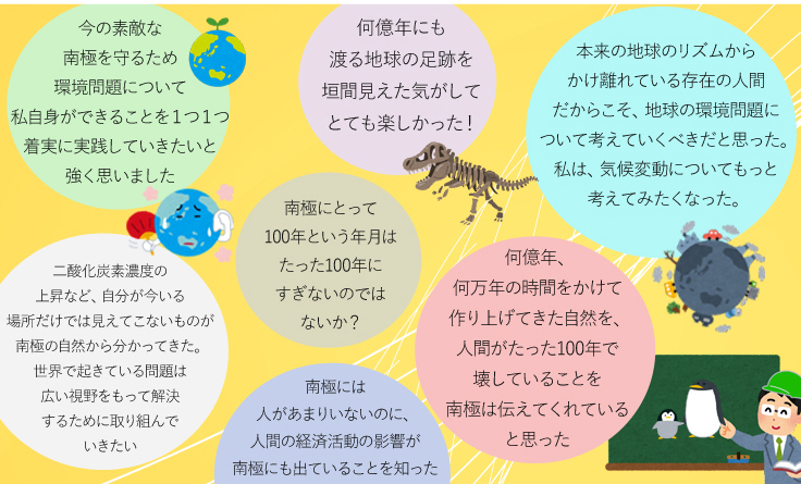 帰国後には学校や社会人向けに講演を行ったり、広報誌やメールマガジンにコラムを掲載したり、啓発活動を行い、多くの方に極地研究について知り、地球の未来について考えてもらう取り組みをおこなっています。