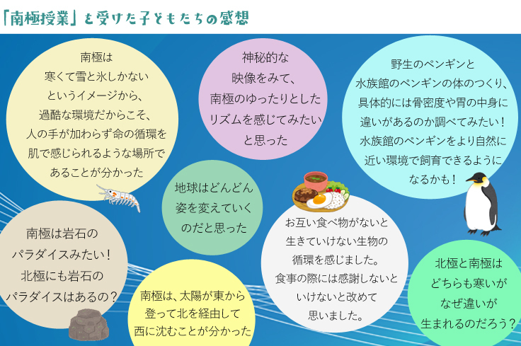 近寄りがたく、少し難しいイメージのある極地ですが、もっともっと身近に感じてもらうために、いつでもどこでも見ることができるデジタル教材の開発をさらに進めたり、これまで20名以上を派遣している南極派遣教員の冒険の記録をまとめた冊子を作る計画も検討しております。