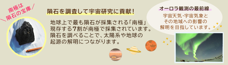 また、南極・北極で見られるオーロラの研究や、大気がきれいで晴天の日が多い南極内陸の高地での天文観測なども始められようとしています。このように極地での観測は地球の未来を考えるだけではなく、宇宙の研究にもつながっています。