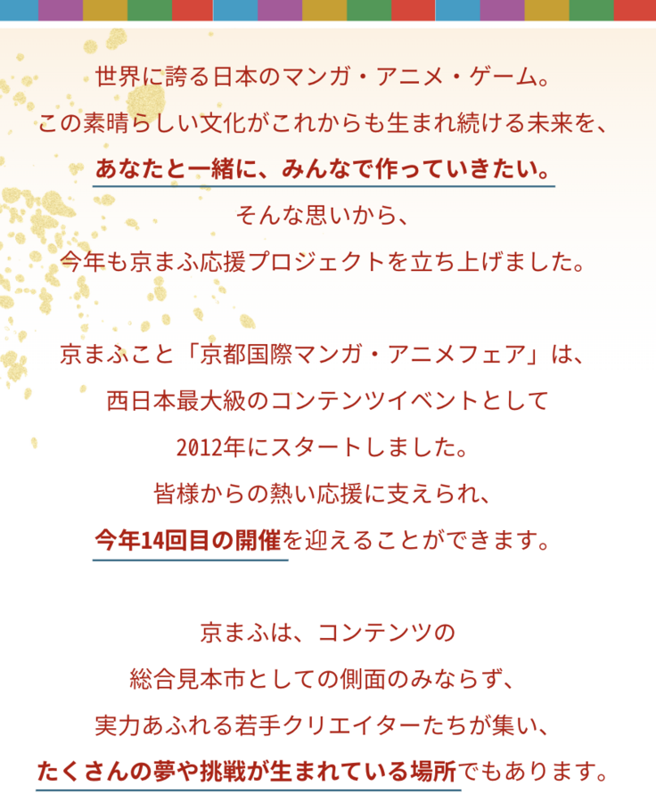 資金の使い道:京まふ2025の運営費(特に若手クリエイター支援の取り組み:クリエイターズコンテスト・クリエイターズブースの運営に活用)