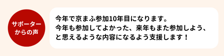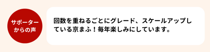 私たちは、クラウドファンディングでご支援いただいた方々を「京まふサポーター(2024年まで京まふ応援団)」とお呼びしています。支援するーされるの関係性ではなく、「一緒に」つくっていく仲間であるという、リスペクトの意味を込めた名称です。京まふの未来を願って応援の声を届けてくださる京まふサポーターは、京まふにとって欠かせない存在です。