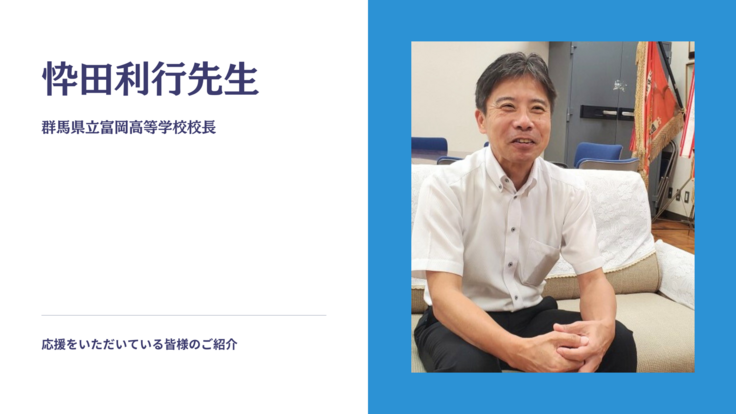 数十年ぶりにお話をさせていただきました、富岡高校校長の忰田利行先生です。今回のプロジェクトにご理解をいただき、応援してくださるとのお言葉をいただきました。高校時代はラグビー部の顧問の先生として大変お世話になりました。まさかこのような形で応援コメントをいただくことになるとは夢にも思いませんでした。学校の周りをひたすら走る、高瀬周りってまだやってるのでしょうか?