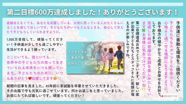たくさんの方々から温かいご寄付や応援メッセージをいただいたことで、 最終目標1,000万円に挑戦することができます。本当にありがとうございます。皆さまからの想いを無駄にしないよう努めてまいります。