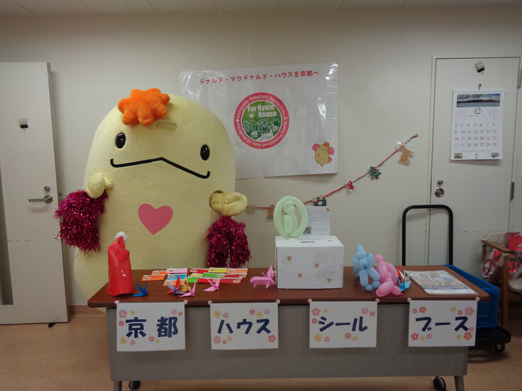 今回は小児医療センターの公式マスコットキャラクター「フレフレちゃん」とともに京都ハウスコーナーを設け、フレフレちゃんシールをお配りしました。入院されている子どもさんとご家族の方からは温かい応援メッセージをいただきました。